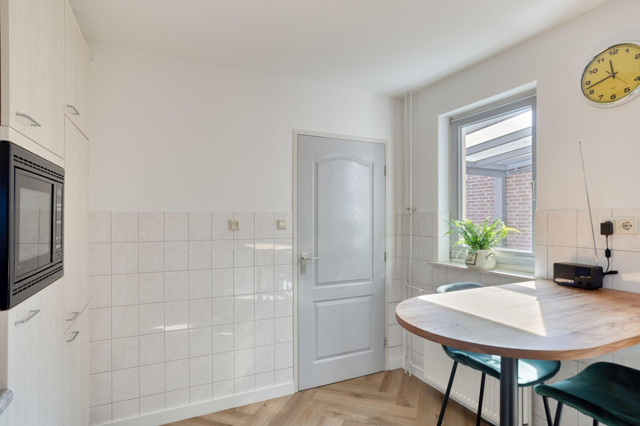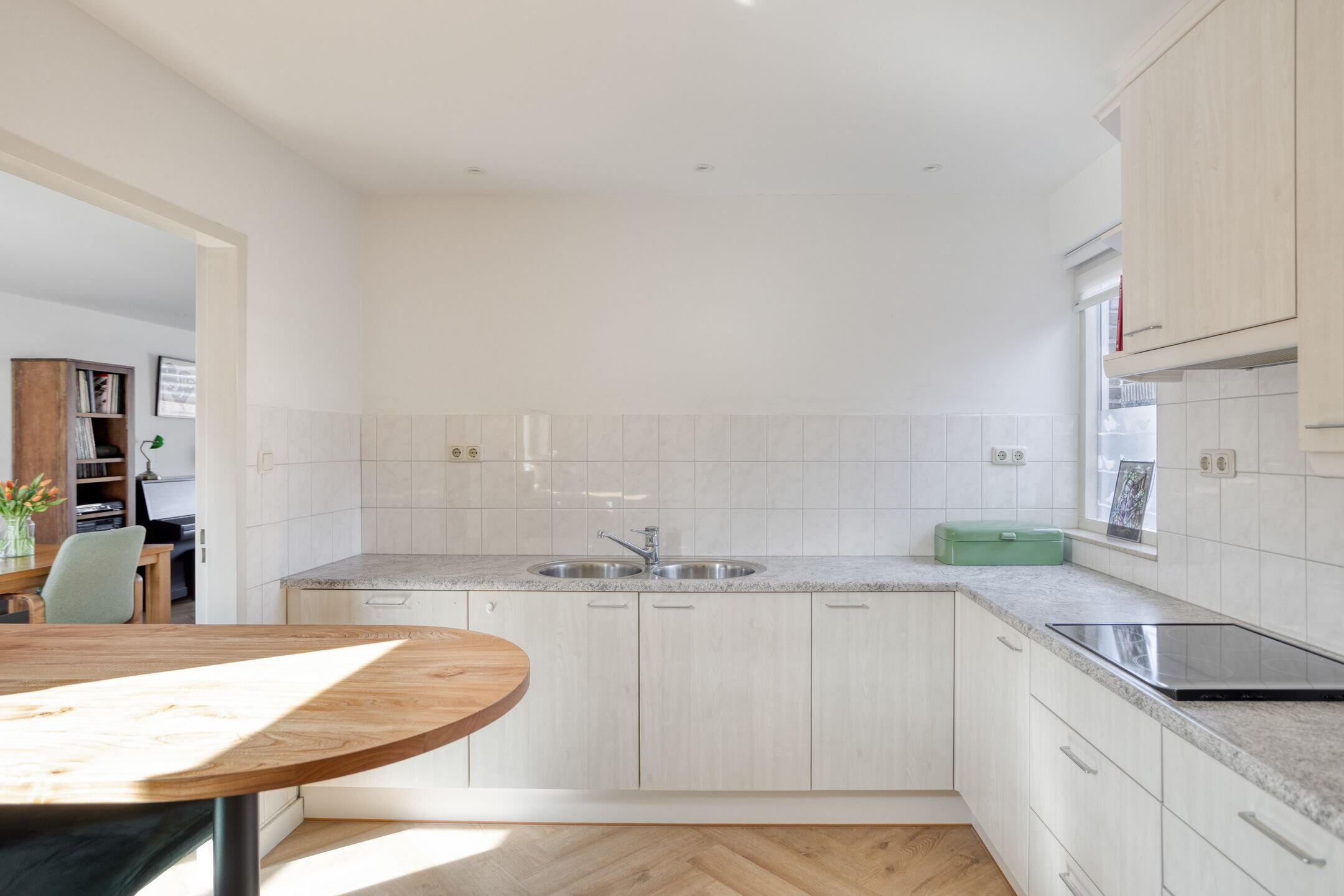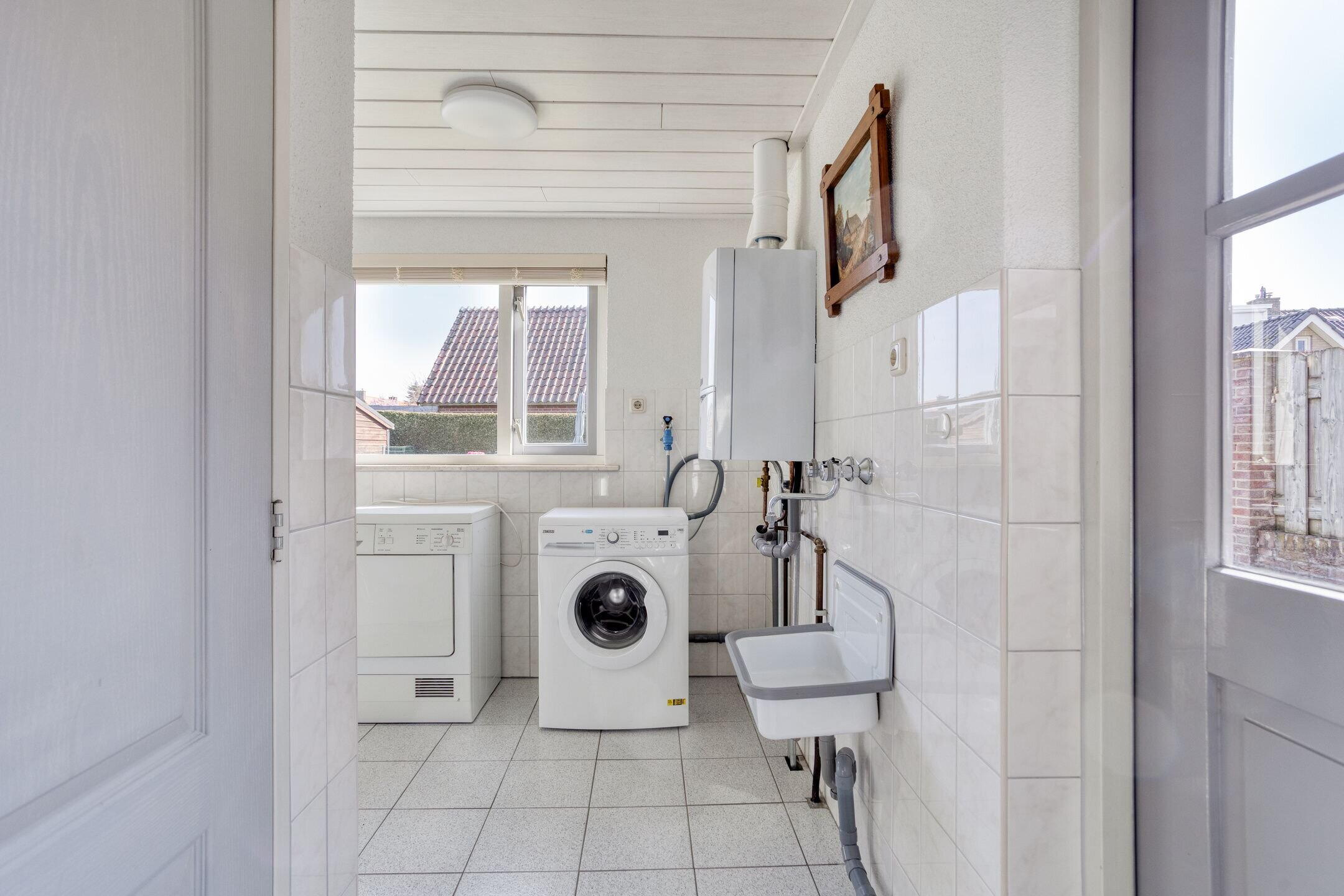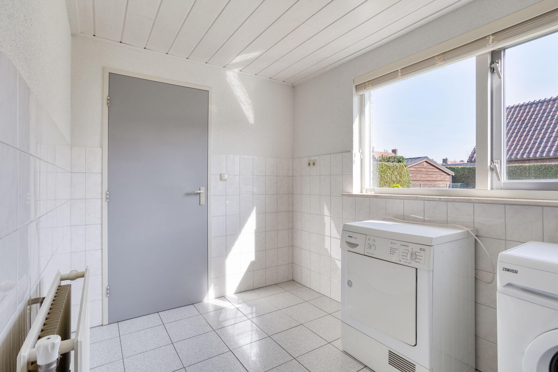 Aansluitend bevindt zich de bijkeuken met was-/droogopstelling, cv-installatie (Vaillant, 2014) en een metalen wasbak. Vanuit hier heeft u toegang tot de aangebouwde garage, de ruime kelder (met buitenventilatie) en de achtertuin.