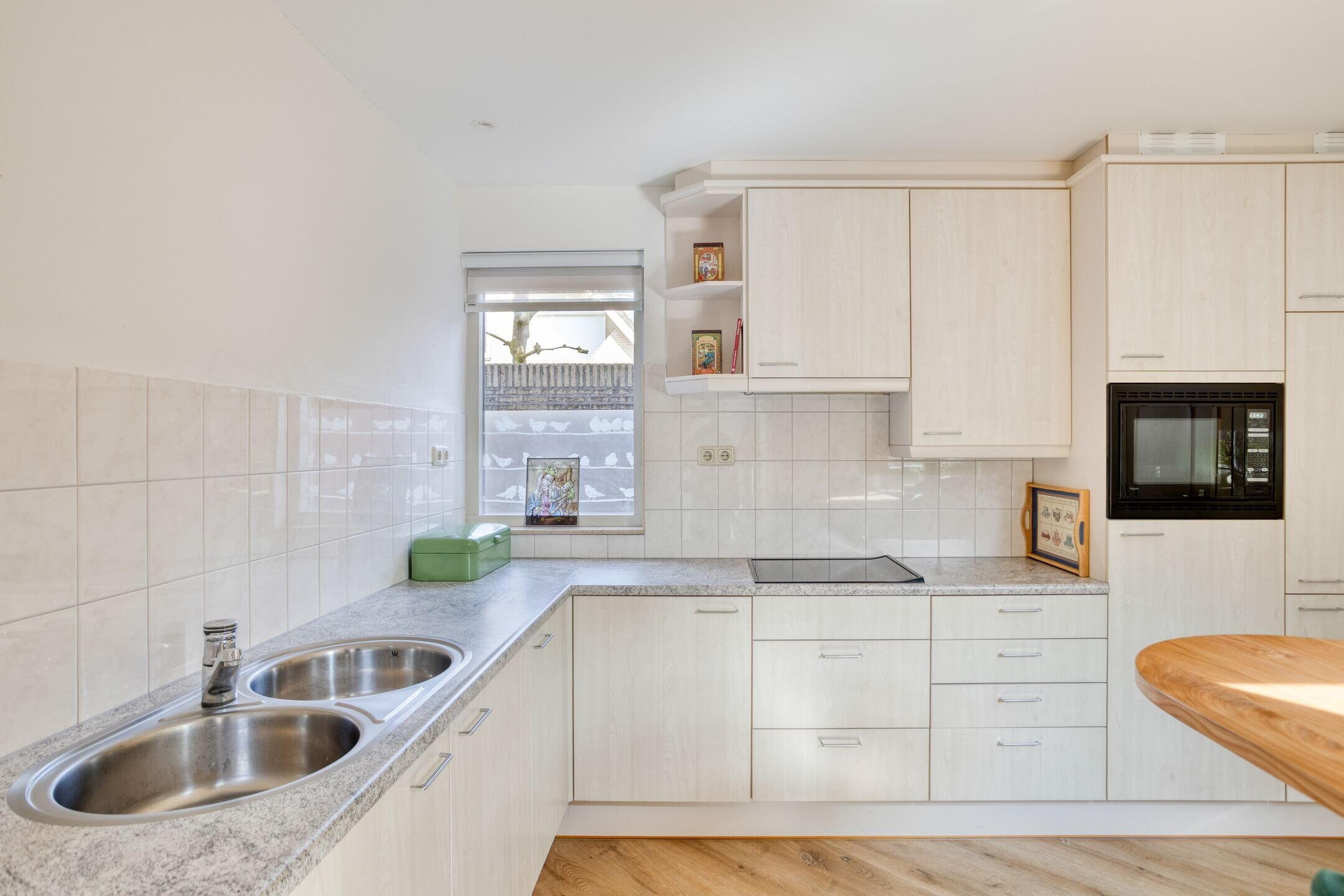De halfopen keuken (Bruynzeel) met barretje is praktisch ingericht en voorzien van diverse inbouwapparatuur, waaronder een elektrische kookplaat, afzuigkap, combimagnetron, koelkast/vriezer en vaatwasser.
