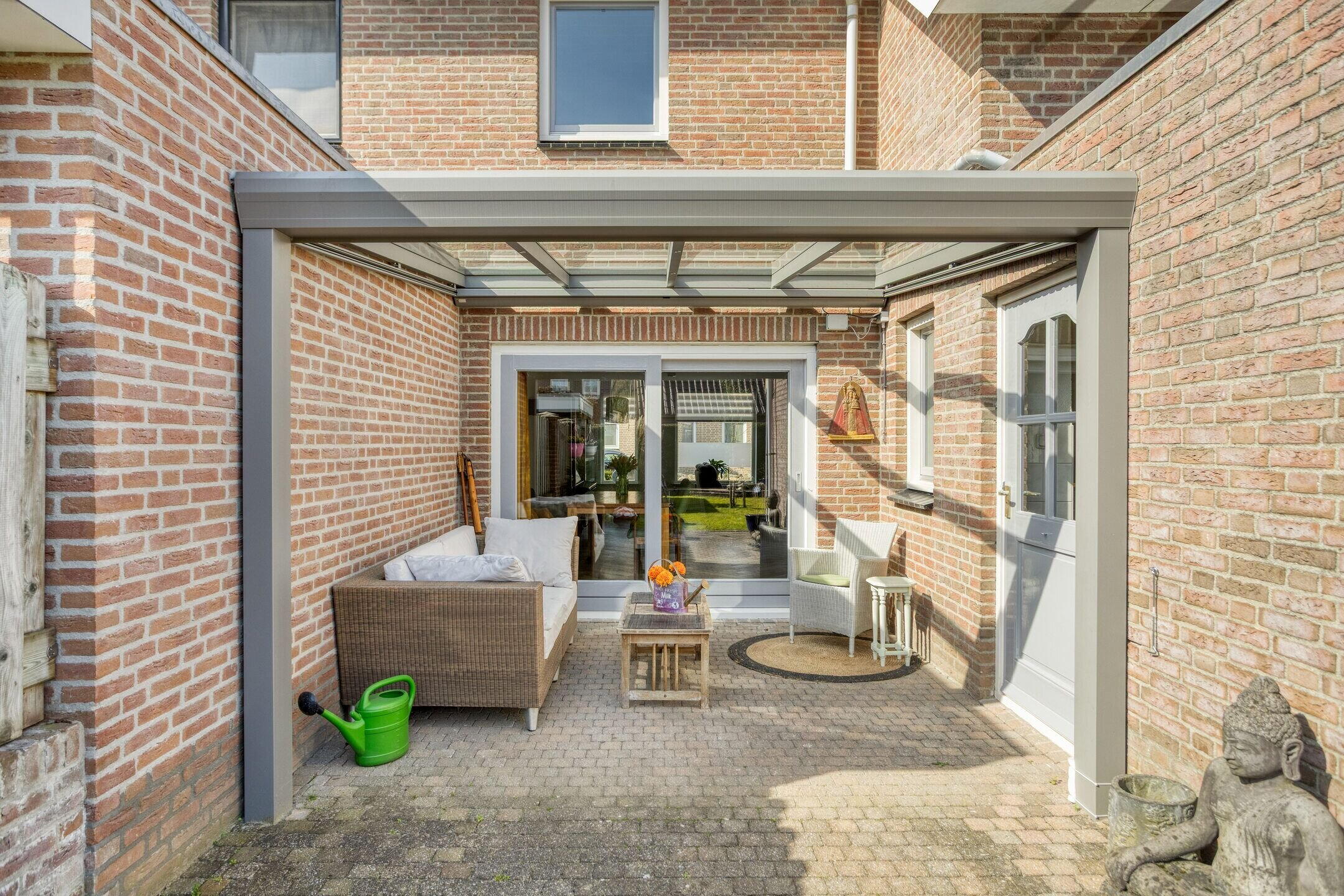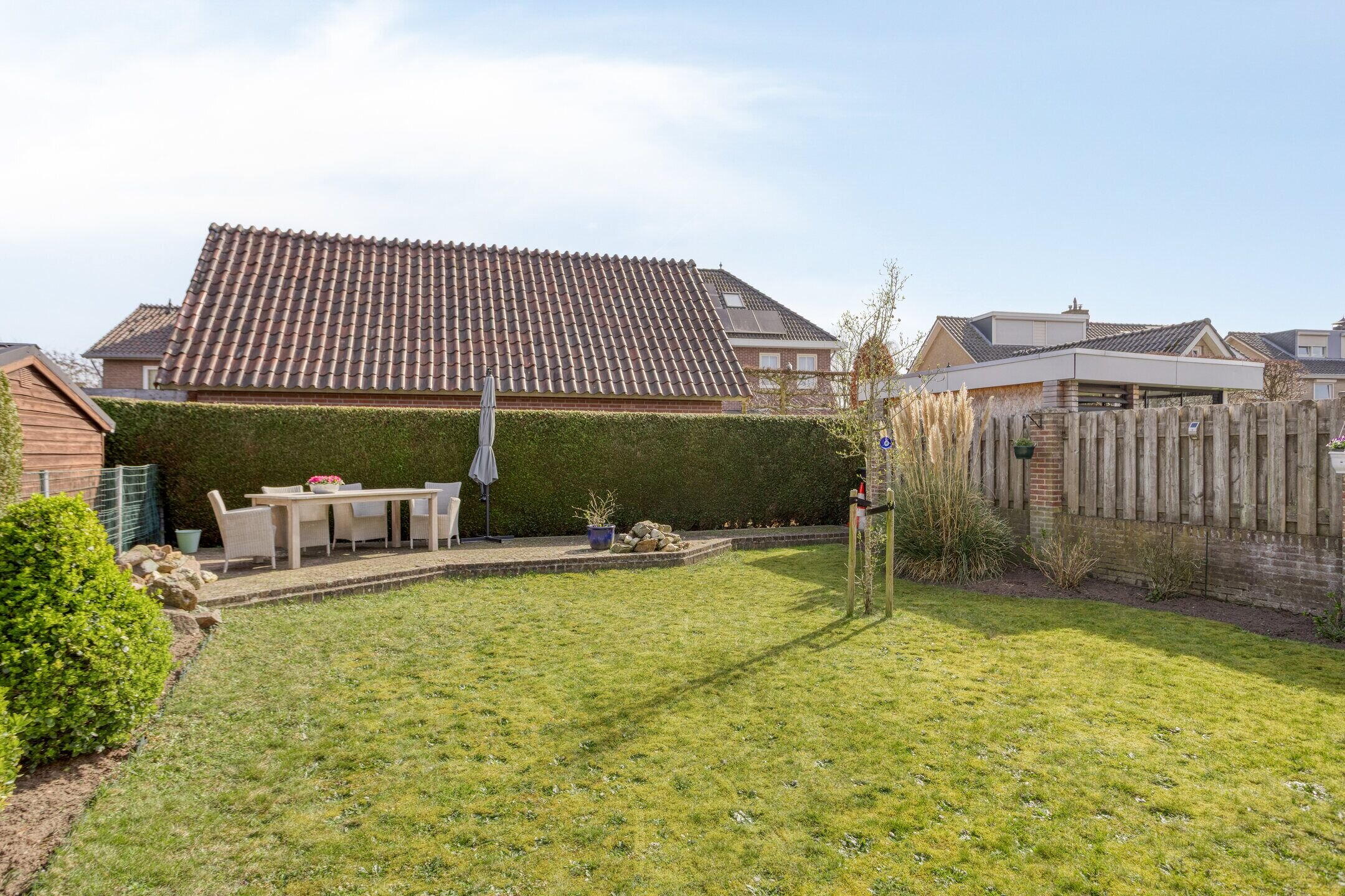 De diepe achtertuin biedt veel privacy en is fraai aangelegd met een windvrij terras direct aan de woning, voorzien van een moderne aluminium glazen overkapping (2023) met zonwering en verlichting. Verder beschikt de tuin over een tweede terras, gazon en diverse borders met vaste planten en heesters. De tuin is rondom groen en beschut, wat zorgt voor een fijne, rustige sfeer.